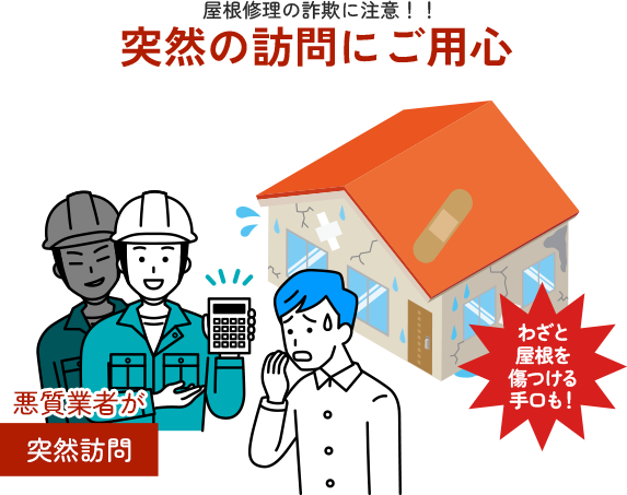 最近、突然の訪問で「屋根に異常があります」と不安をあおり、高額な修理を勧める業者が増えています。中には、わざと屋根を傷つけて「今すぐ修理が必要」と偽る悪質な手口も。